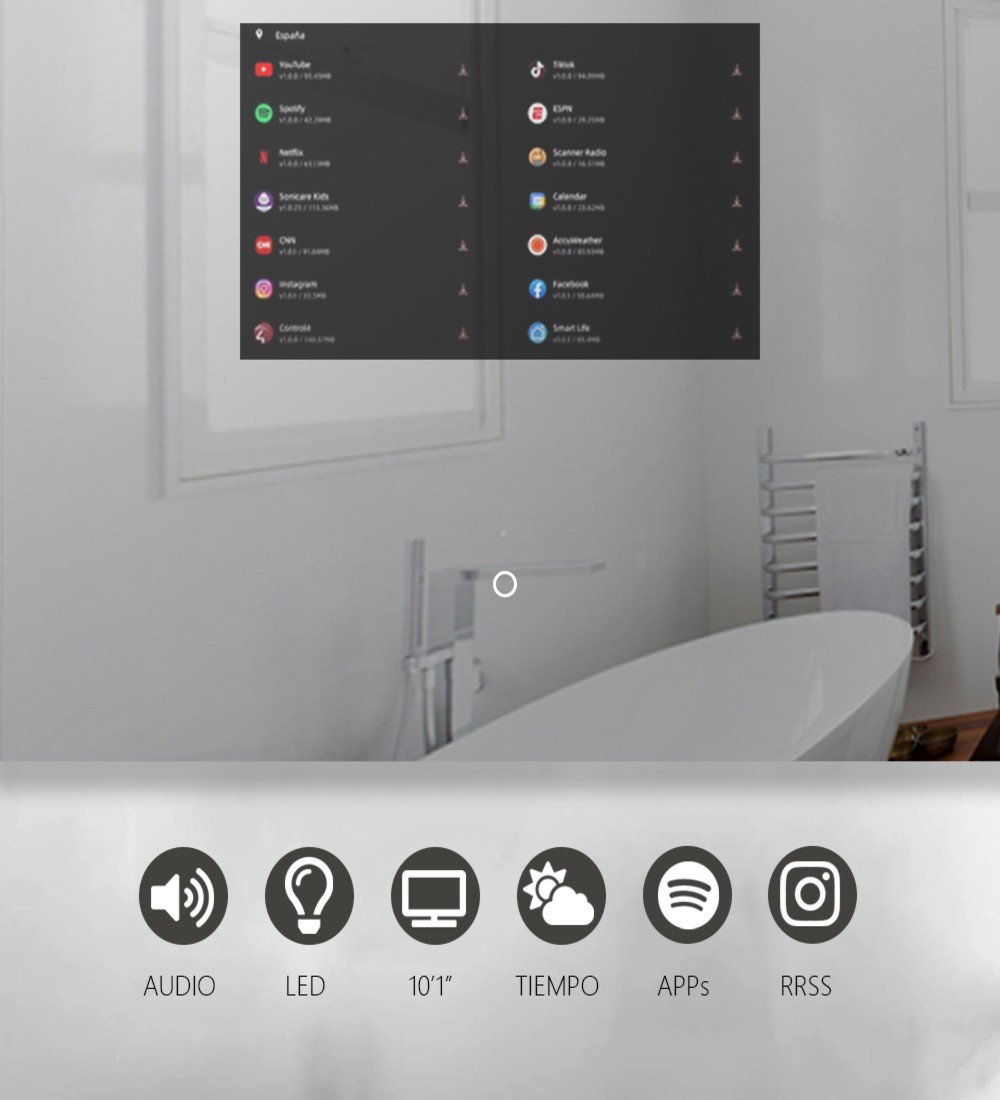 Este espejo inteligente para baño con pantalla táctil y revestimiento anti-huellas ofrece un diseño minimalista y elegante, con una tapa trasera plana de solo 2 cm de grosor. Su construcción es totalmente resistente al agua y al polvo, lo que lo hace ideal para el ambiente del baño. Además, no requiere de un dispositivo móvil para su control, lo que garantiza una experiencia sencilla y autónoma.