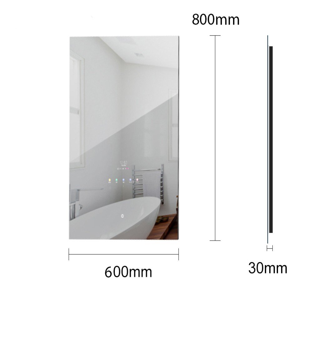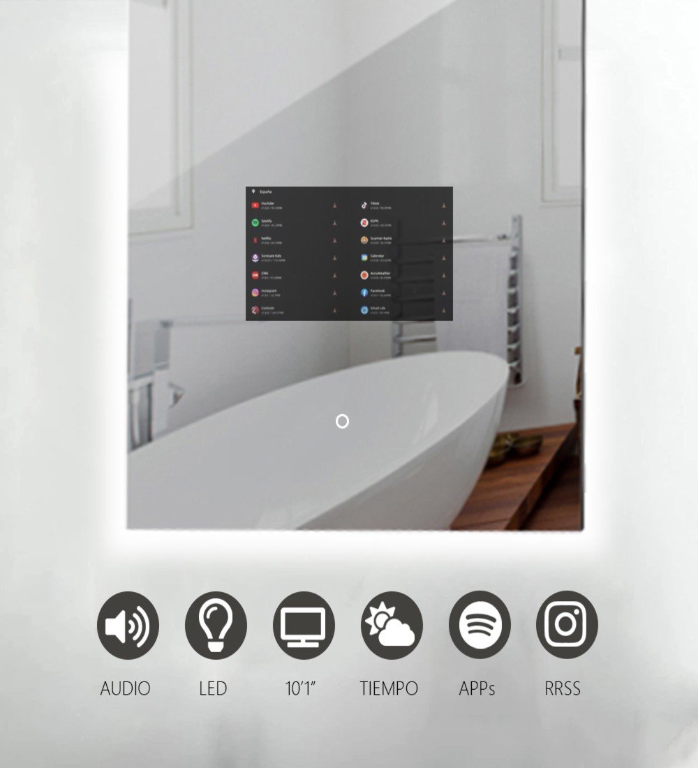 Este espejo retroiluminado VR6080 con pantalla táctil HD de 10,1″ y revestimiento anti-huellas presenta un diseño minimalista sin biseles, lo que le otorga un aspecto elegante y moderno. Además de ser ideal para el baño, sus características lo hacen perfecto para integrarse en dormitorios, tocadores, vestidores y recepciones. Es totalmente resistente al agua y al polvo, lo que lo hace adecuado para ambientes húmedos. No requiere de ningún dispositivo móvil para su control, brindando comodidad y facilidad de uso.